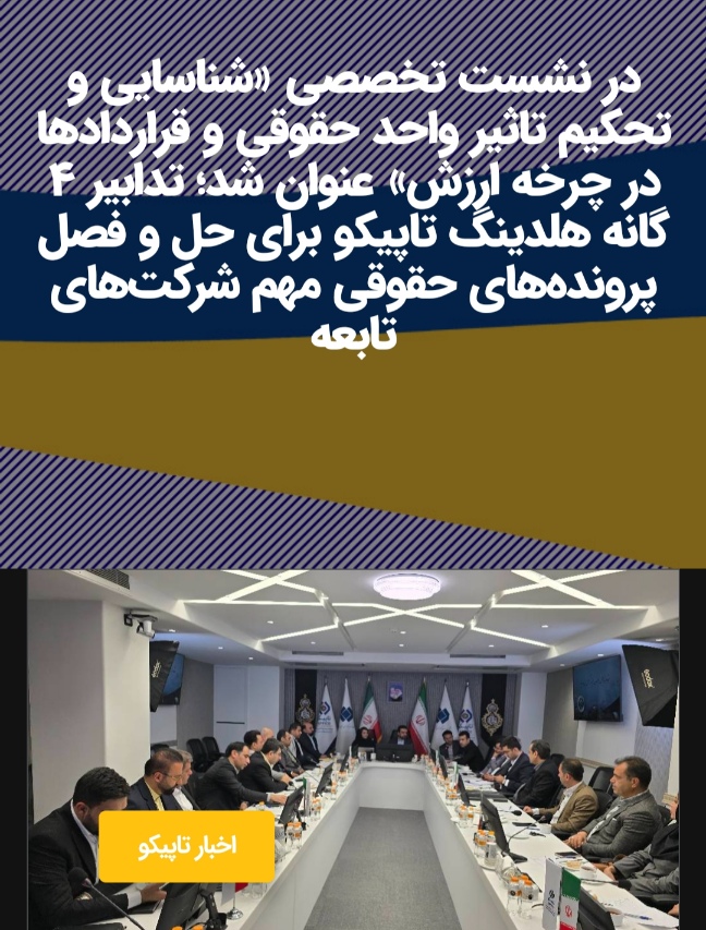 در نشست تخصصی «شناسایی و تحکیم تاثیر واحد حقوقی و قراردادها در چرخه ارزش» عنوان شد؛ تدابیر ۴ گانه هلدینگ تاپیکو برای حل و فصل پروندههای حقوقی مهم شرکتهای تابعه