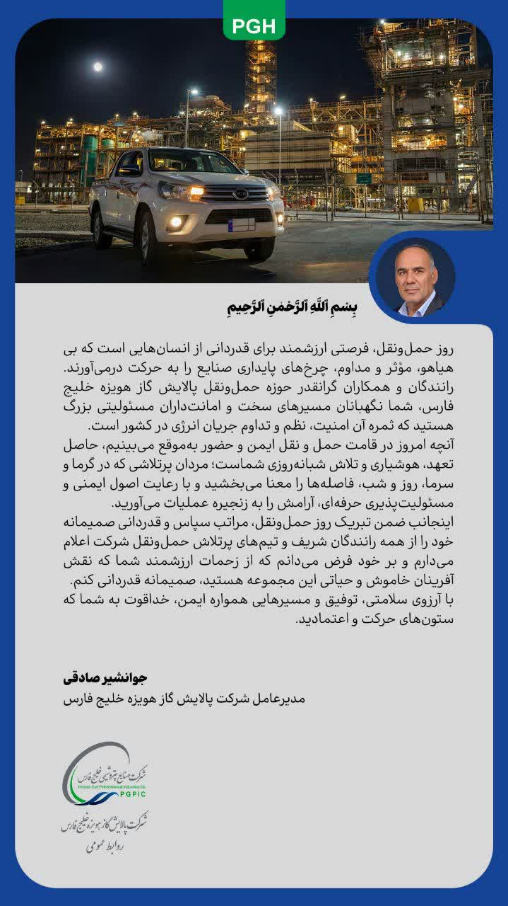 پیام مدیرعامل شرکت پالایش گاز هویزه خلیج فارس به مناسبت روز حمل و نقل و رانندگان