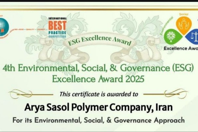 به گزارش پایگاه خبری پتروشهر به نقل از روابط عمومی شرکت پلیمر آریاساسول، گواهینامه‌های چهارمین دوره جایزه تعالی پایداری (ESG) مبتنی بر حوزه­‌های محیط زیست، اجتماع و حاکمیت سال ۲۰۲۵ تحت نظارت مسابقه برترین تجارب بین‌المللی (IBPC) (IBPC 4th Environment, Social, Governance Excellence Award 2025) برای آریاساسول صادر شد.
